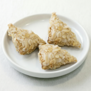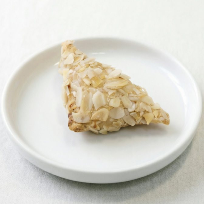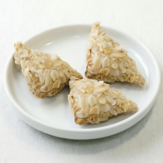Нежный творожный кармашек из воздушного творожного теста, наполненный освежающей начинкой из творога и цедры лимона, сверху - посыпка из миндальных лепестков