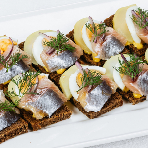 Брускетта с нежным филе сельди, ломтиком картофеля, кольцом красного лука, кружком яйца на горчичном соусе на кусочке хрустящего бородинского хлеба