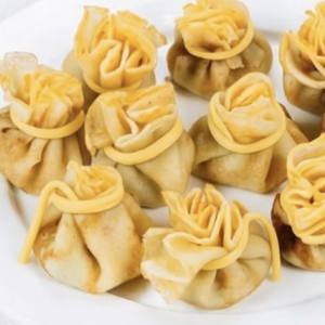 Ароматный блинчик с сытной начинкой из нежного куриного филе и шампиньонов с листом салата. Украшен красным луком и зернами белого кунжута