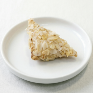 Тонкий золотистый блинчик с начинкой из карамелизированных яблок и воздушным сливочным кремом. Украшен миндальными лепестками