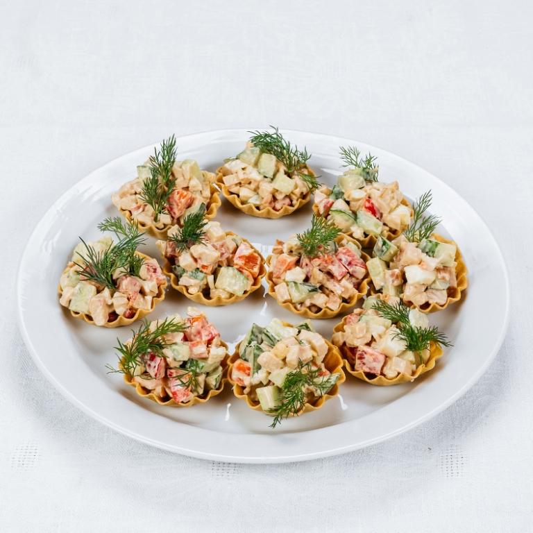 Нежная копченая куриная грудка, яйцо, сыр моцарелла, перец красный, свежий огурчик, зелень, заправленные салатной заправкой в хрустящей тарталетке
