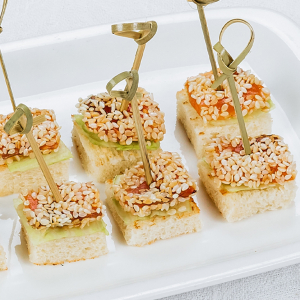 Канапе со слабосоленой форелью в кунжутных семенах, творожным сливочным сыром, веточкой зелени на хрустящем пшеничном тосте
