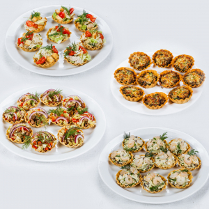 ассорти брускетт, ассорти профитролей, волованы, ассорти тарталеток, пирожное «Наполеон», трайфлы с вишней и с соленой карамелью